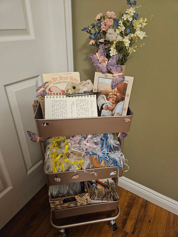 This rolling care cart is for bereaved families at the Health Science Center and contains Everly’s crochet bunnies, key chains, ornaments, bracelets, notes books, teas and other various items.